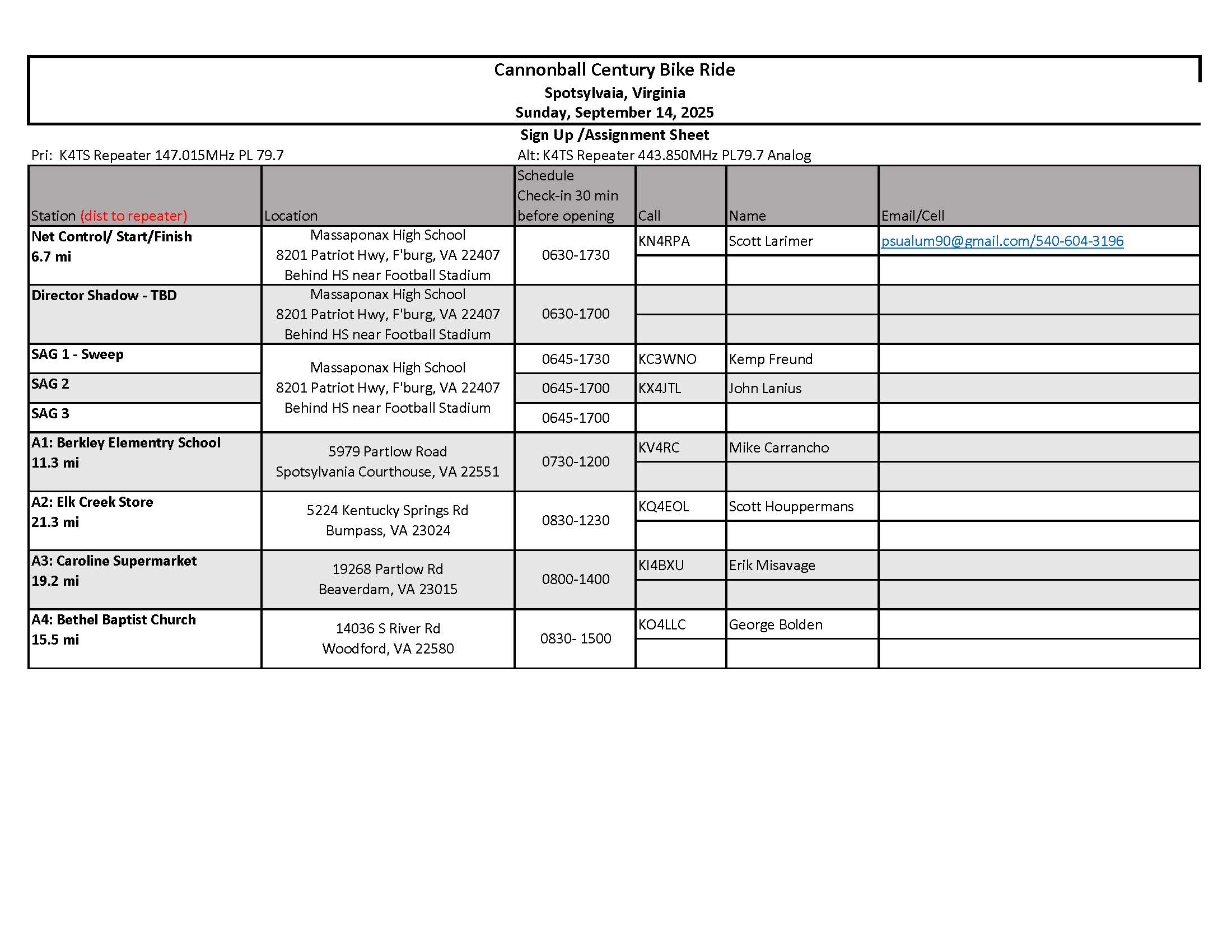 If all else fails I have everyone's cell phone number. Please have the cell phone number for the ECIC (Scott Larimer, KN4RPA ECIC (540--604--3196)) with your in your phone on race day