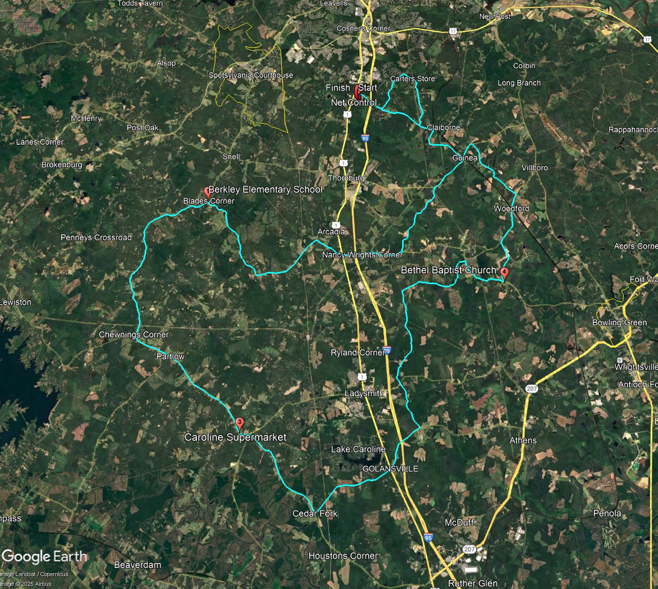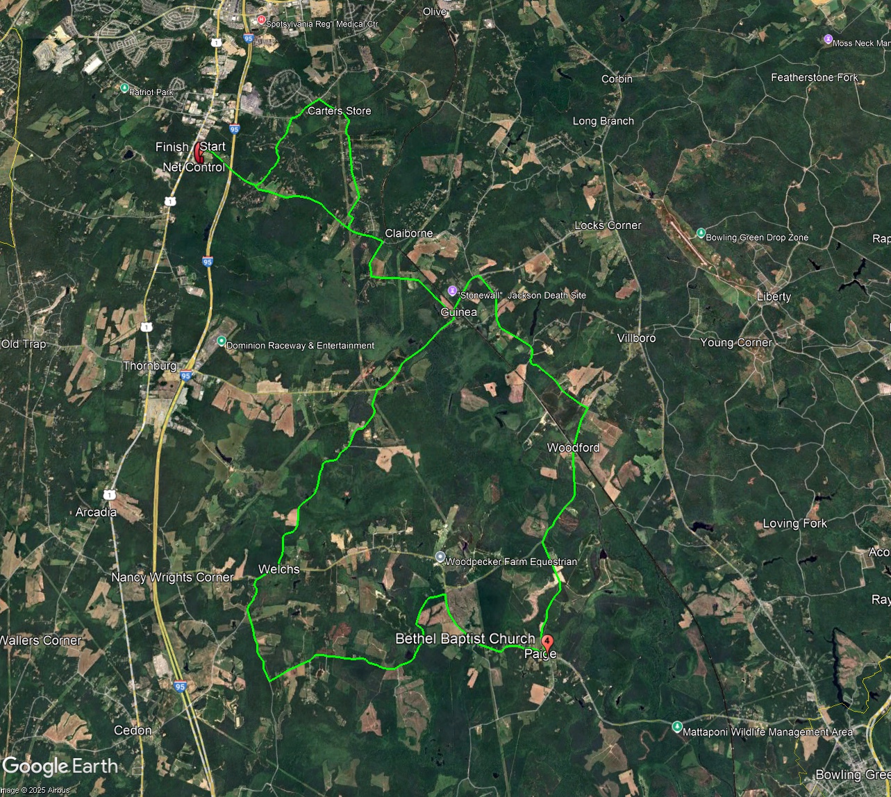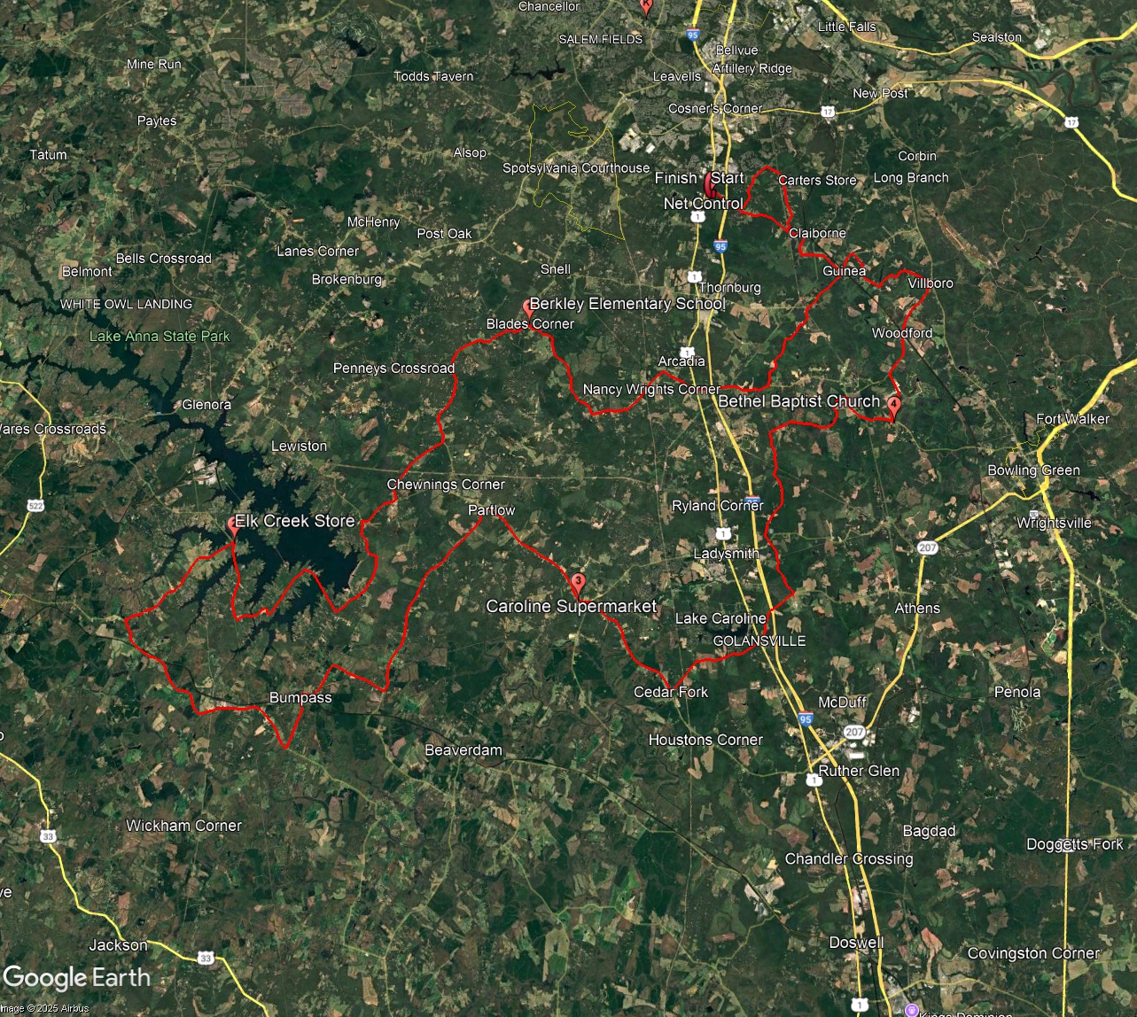 This is a very large course. Most stations will not reliably be able to hit the repeater with an HT only. Other than Net Control, closest station is 11.3 miles from the repeater. All stations will need at least a mobile radio and some stations will most likely need a mobile an a mast.