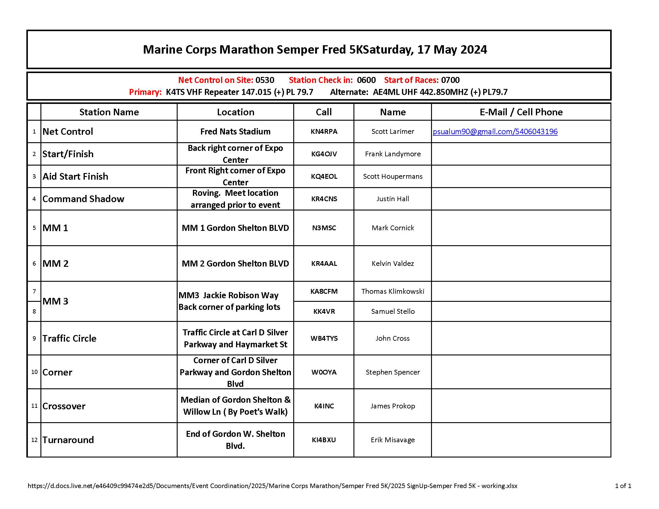 To volunteer as an Amateur Radio Operator for the Marine Corp Marathon Semper Fred 5K the process is handled through the Marine Corps Marathon Office's Volunteer Portal. The link to that portal for the Half Marathon is https://xactllc.volunteerlocal.com/volunteer/?id=96089. Look for Saturday, May 17th and then "Amateur Radio Operator (Licensed Operators Only)". All information that I need to complete your assignment will be harvested from their database. If you have a preference for location put it in the "Additional Comments for Volunteer Coordinator or Component Lead i.e., Medical Lead" field.