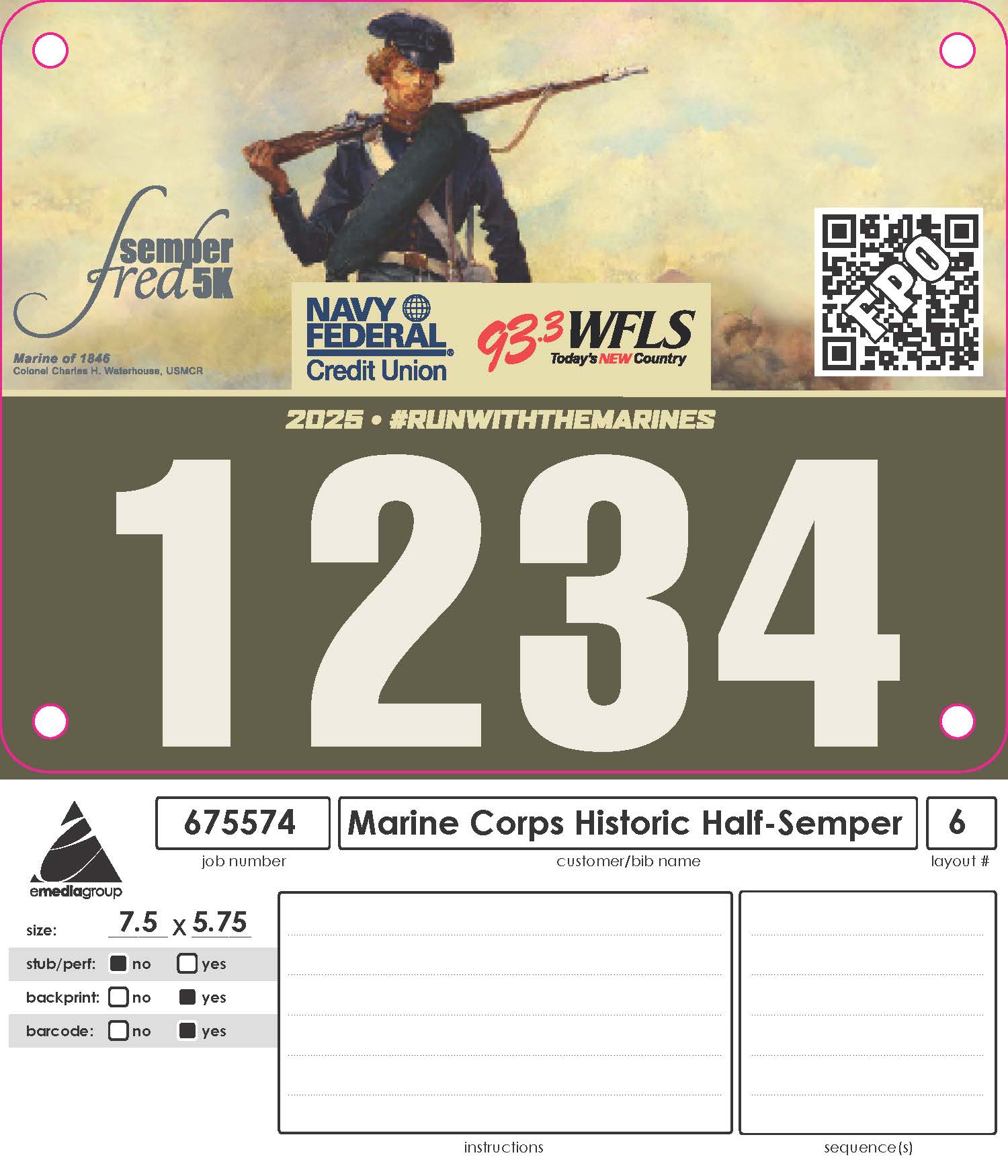 The bib designs are as follows for this year. You will be asked for the first male and first female runner with bib number for each race. BIB IMAGES WILL BE UPDATED CLOSER TO RACE DAY. STILL TBD.
